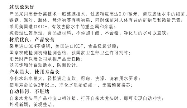 | 使用壽命: | ≥3年(當原水為市政自來水時,根據水質差異,濾芯使用壽命不同,但一般不低于3年) |